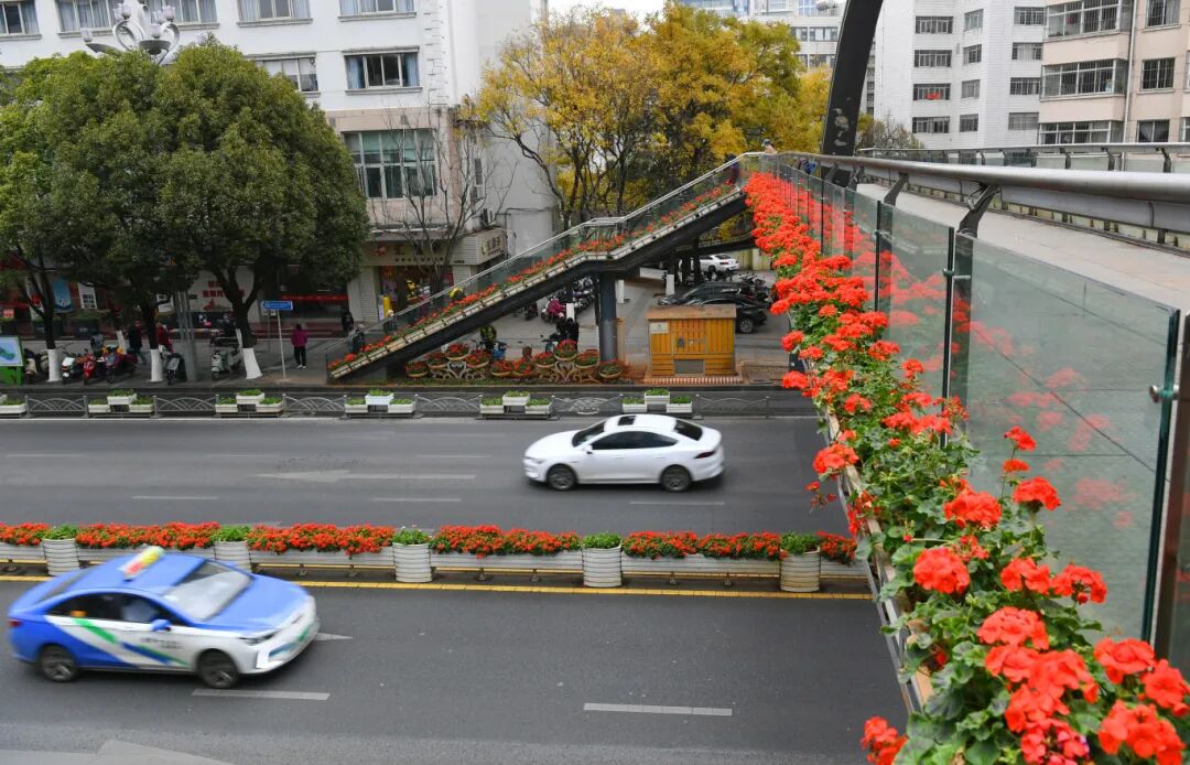 路上隔離帶、人行天橋被鮮花裝扮一新。楊艷輝/攝